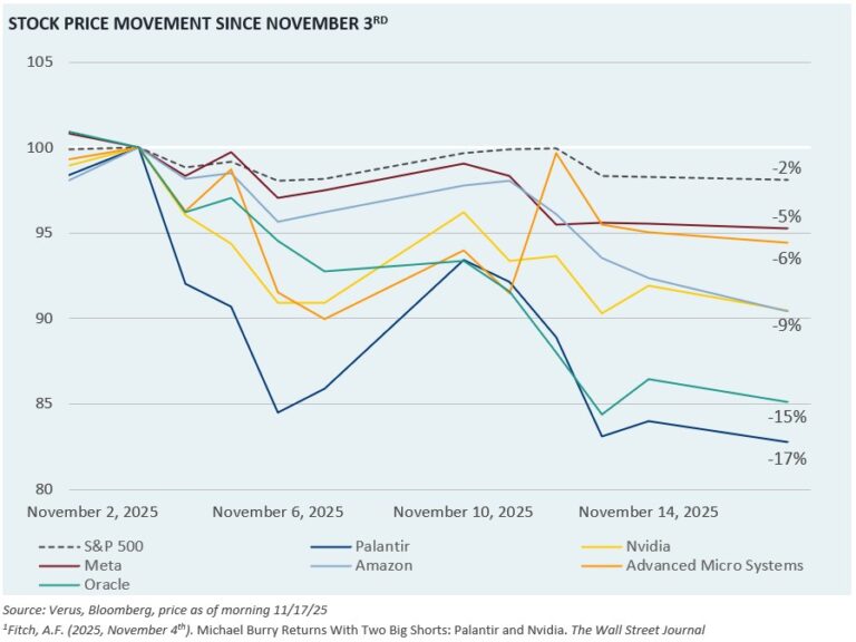 On November 4th, it was made public that Michael Burry, founder of Scion Asset Management and known for his hugely successful bets against the housing market in 2008, had accumulated very large bets against Nvidia and Palantir over concerns about A.I. company valuations1. This appears to have triggered an immediate selloff in those two stocks as well as others in the space. Fears had already been building across the investor community regarding A.I. funding models, lofty valuations, and whether the hype might be overdone. Burry’s post seemed to help trigger a selloff and some pricing in of these fears.