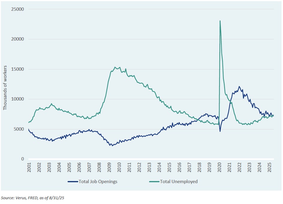 Following Covid-19 pandemic lockdowns, a general excitement to return to normal life along with excess household savings helped contribute to very strong consumer spending and a quickly growing economy. During this time, American businesses were hiring at a rapid pace. These dynamics resulted in the greatest job market mismatch in modern history, as represented by far more job openings than available workers. Since then, it appears that the labor market has slowed and that the country has returned to an environment more consistent with pre-pandemic conditions.