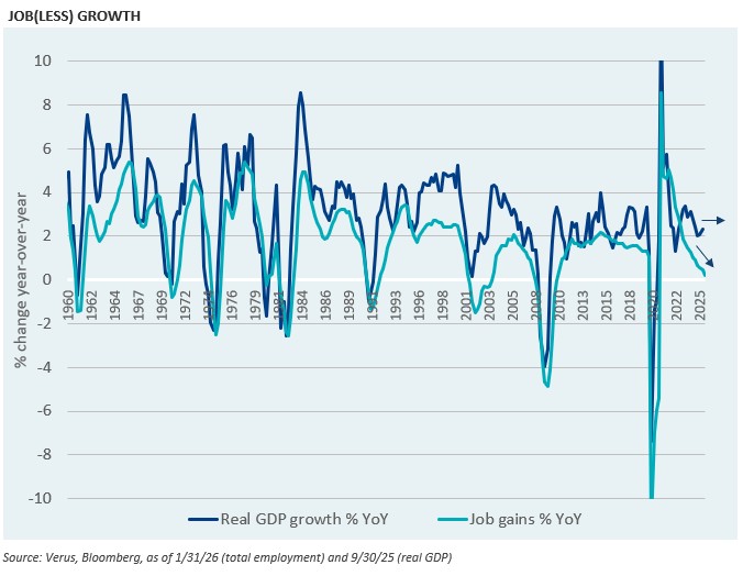 U.S. economic growth surprised to the upside during 2025, and it appears that the calendar year real growth rate will likely show in the mid-2% range. Meanwhile, job creation slowed and was barely positive over the past year, with nonfarm payrolls increasing a paltry +0.2%, as of January. Economic expansions without meaningful job growth have been somewhat rare, historically speaking.