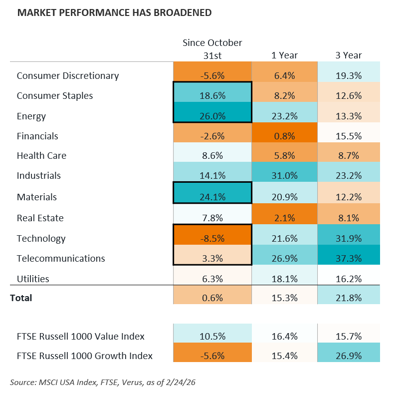 In this week’s Market Note, we highlight recent notable sector performance disparity. Top performing sectors of the past three years such as Technology and Telecommunications have seen muted returns, while certain longer-term underperforming sectors such as Consumer Staples, Energy, and Materials outperformed the index by a large margin. It seems that fears around AI innovation and the creative destruction that may result is contributing to changing investor sentiment. Investors have arguably moved away from a growth at any price mentality to a focus on companies with profitability, cash generation, and business models that are more durable to AI innovation. This has been referred to as the “HALO” trade—movement of funds into Heavy Assets Low Obsolescence stocks.
