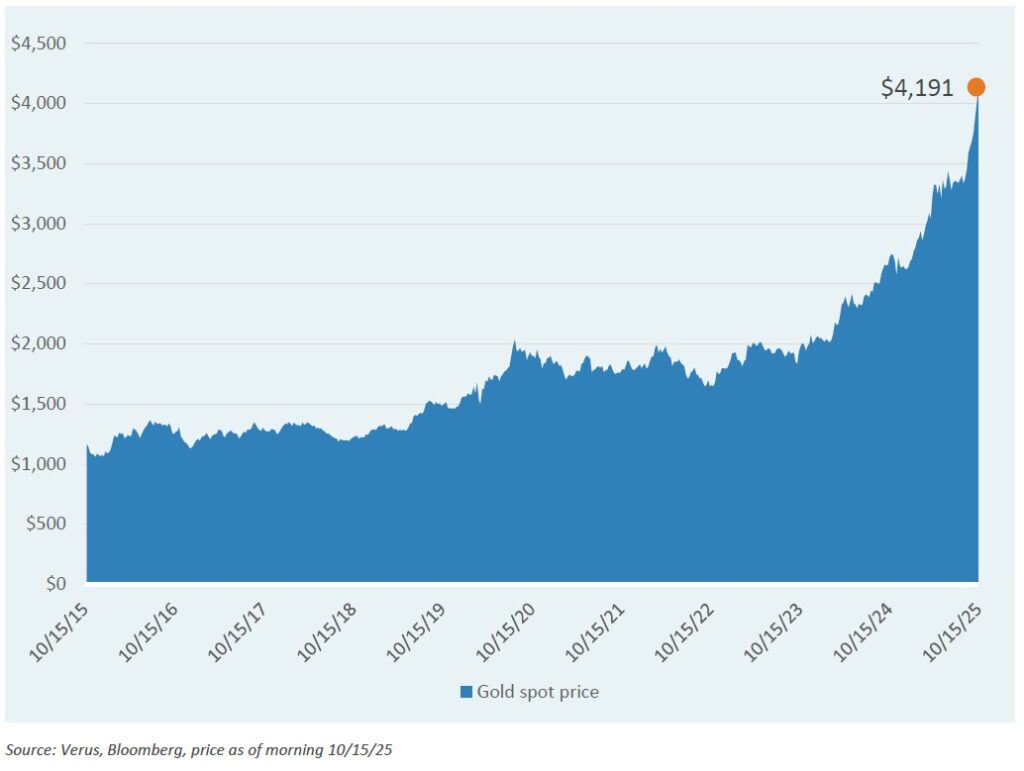 In this week’s Market Note, we illustrate the rise of gold price given its renewed popularity. Much of the recent commentary around gold’s rally has pinned this trend on rising risks of inflation and currency debasement. We are skeptical of this story, at least in terms of describing year-to-date performance, given that inflation expectations have not moved higher during that time (neither TIPS Breakeven Rates nor 5-year forward inflation), and the U.S. dollar is slightly higher since the passing of the “One Big Beautiful Bill Act” in July.