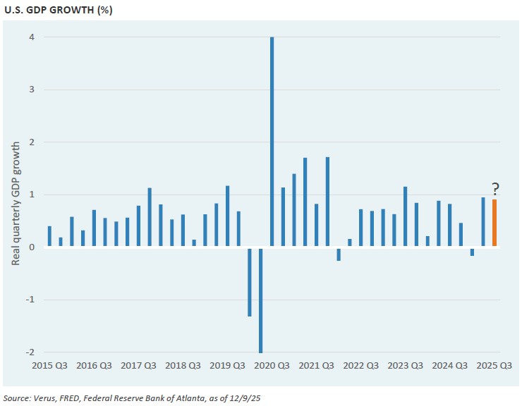 Following the shift in U.S. trade policy that occurred in April, economists and many in the investor community warned of a sharp economic slowdown and likely a meaningful recession in 2025, fueled by job losses as employers downsized to cope with falling trade and an upward shock to inflation which would hurt demand. At Verus, we were skeptical of those calls for economic calamity throughout this period, as reflected by our moderately risk-on position in U.S. equities, and then our move to a total portfolio risk overweight in July. This call has proven profitable, as economic growth domestically and globally has consistently surprised to the upside, while inflation has barely budged.